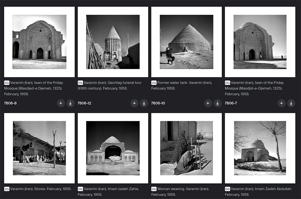 Numérisées au début des années 2000 à la demande du service de la conservation et de la valorisation des Collections Roger-Viollet, choisies pour leur qualité esthétique et leur « attractivité », les quelques 300 photographies numérisées de cet ensemble iranien donnent une image ouvertement tronquée et déformée de la production complète (4932 photographies), correspondant à la manière des fondateurs d’accumuler puis de diffuser les photographies. Huit de ces 300 photographies numérisées ont été prises par le couple à Varamin en 1958, mais dans la collection totale, 110 numéros concernent Varamin (figs. 7–8 ; voir aussi Architectural Heritage).
