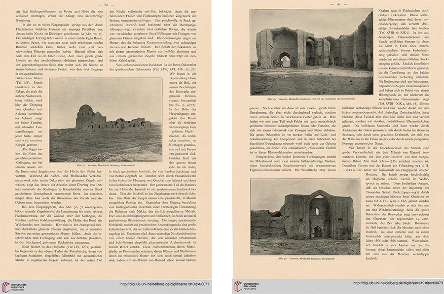 - Sarre, Friedrich. Denkmäler Persischer Baukunst. Unter Mitwirkung von Bruno Schulz und Georg Krecker, mit epigraphischen Beiträgen von Eugen Mittwoch und Martin Hartmann. Berlin: 1910. (this volume appeared since 1901 in fascicles) [Heidelberg University Digital Library]