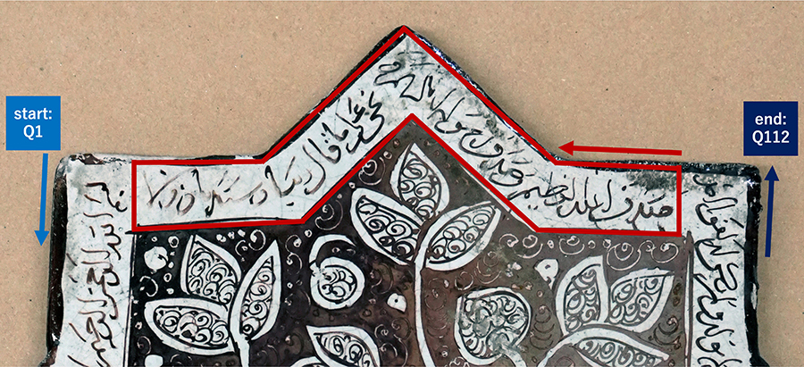 The Shikoku Folk House Museum Foundation in Takamatsu, Japan (map, website) owns two star tiles attributed to the Emamzadeh Yahya at Varamin. The first tile (no. 23) features a pond with two fish and a stylized symmetrical plant with leaves extending outward into the space above. Its inscription begins with the opening sura al-Fatiha (1), written from the upper right corner to the lower left corner, followed by sura al-Ikhlas (112), written from the lower left corner to the lower right corner. The inscription concludes with an incomplete Arabic prayer of the type occasionally inserted as filler between two sets of Qurʾanic verses (for variants of this prayer, see Hassanalipour and Sedighian 1402 Sh/2023–24, p. 197) (fig. 1):