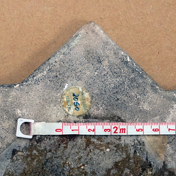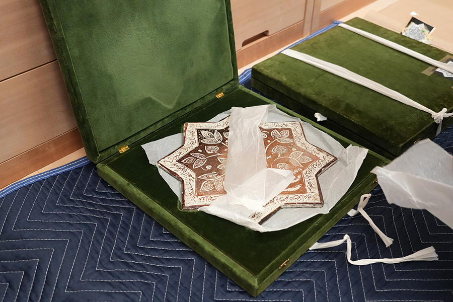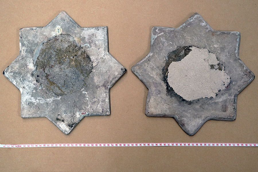 In 2002, the tiles were transferred to the Shikoku Mura Gallery, a public gallery exhibiting Kato’s collection within Shikoku Mura, an open-air architectural park located at the foot of Mount Yashima. The year prior, they were featured in “Burning Colours on Desert: 5000 Years of Tile Design in the Middle East,” an exhibition held at the Okayama Orient Museum (map, website). It was in the catalog of this exhibition that Tomoko Masuya first attributed the tiles to the Emamzadeh Yahya (Masuya 2001, p. 79, 118; see also her seminal article on the collecting of luster tiles from Iranian shrines). The backs of both tiles bear distinct round stains indicative of previous adhesion, but to what exactly remains unclear (fig. 2). Both of the tiles are currently stored in custom-made boxes (fig. 4).