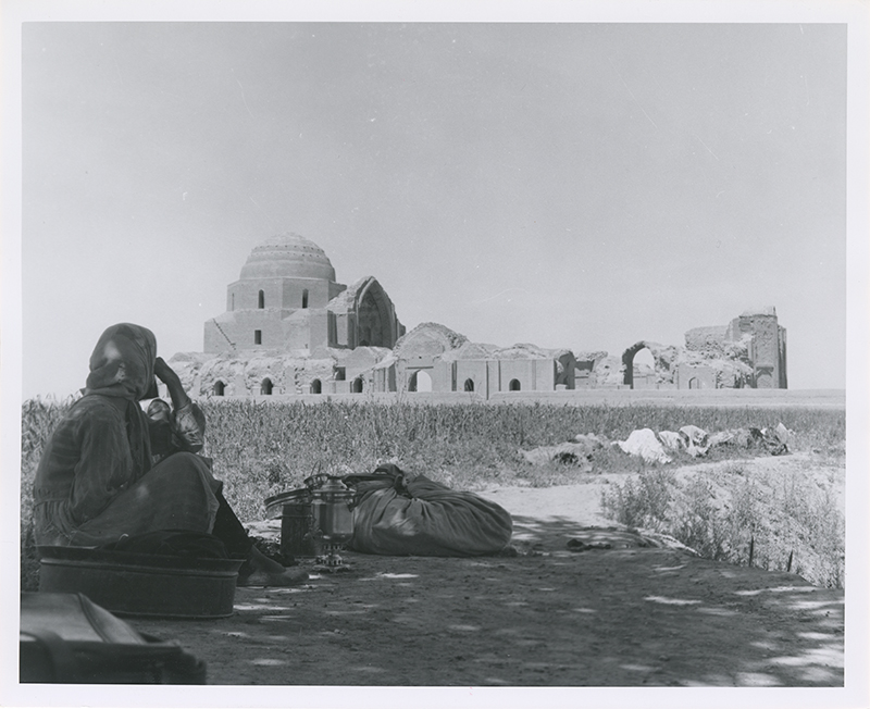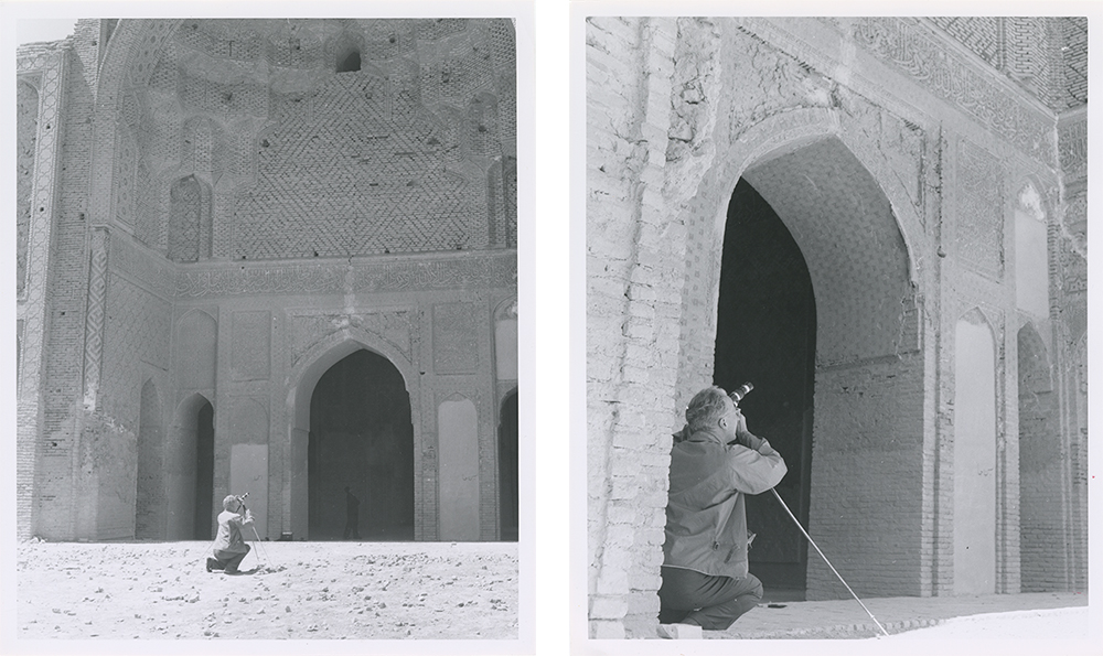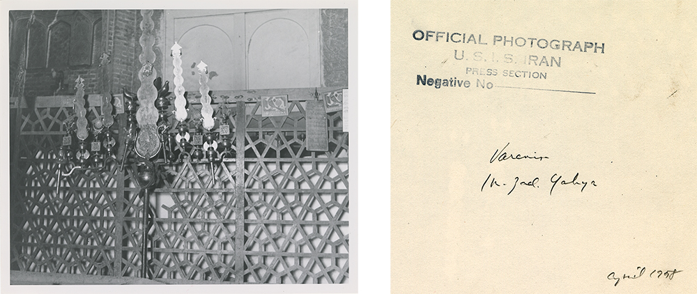 Smith first visited Varamin in October 1934 and then returned in April 1958. On the first trip, he photographed the congregational mosque, and also produced architectural drawings of it. During the second trip, which was connected to a United States Information Service lecture tour through the Middle East, Smith and an unknown colleague took about a dozen photographs of the congregational mosque, and Smith himself was photographed at work (fig. 2–4). Two photographs were also taken inside the Emamzadeh Yahya, including an important image of ritual objects (fig. 5). A stamp reading “Official Photograph U.S.I.S. Iran Press Section” appears on the reverse of his 1958 photographs.