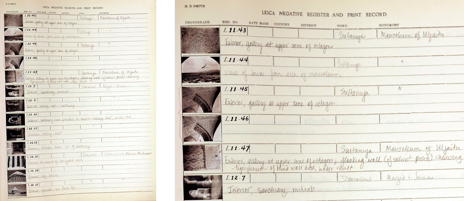 Anticipating the critical role of photography in scholarship, Smith conceived his own repository called the Archive for Islamic Culture and Art (or ‘the Islamic Archives’), with his own works as the core. He also sought to collect photographs by a wide range of other photographers and institutions working in the Islamic world. Mostly notably, in 1951, the Islamic Archives acquired all 695 surviving glass plate negatives from the studio of Antoin Sevruguin (d. 1933), one of the pioneers of photography in Iran. The Islamic Archives ultimately grew to include a range of additional materials, but its core remained photography.