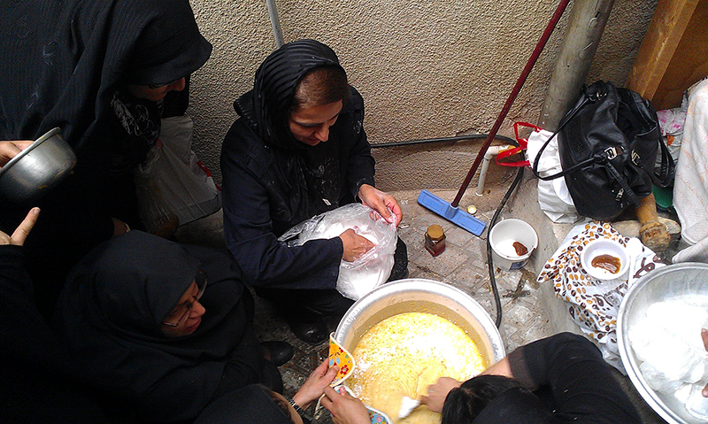 پختن غذای نذری و توزیع آن معمولاً فعالیتی جمعی است. حتی اگر نذری در خانه پخته شود و در مقیاس کوچک میان همسایهها و اقوام نزدیک توزیع شود، معمولاً عدهای به کمک میآیند و مراسم «نذریپزان» راه میافتد (ت. ۷). علاوه بر خانه، کوچههای محله و مکانهای عمومی مذهبی، مثل مسجد و تکیه و حسینیه و امامزاده، از مکانهای رایج برای نذری دادن است. در این مکانهای عمومی، معمولاً حجم بیشتری غذای نذری پخته میشود و تا وقتی غذا هست، هر کسی چه آشنا و چه غریبه میتواند بیاید و نذری بگیرد. البته نذری دادن به غریبهها منحصر به نذریهایی که در مکانهای عمومی پخته میشود نیست. در بسیاری از نذریهای روزهای تاسوعا و عاشورا که در خانهها پخته میشود هم غریبهها میتوانند بیایند و نذری بگیرند. معمولاً جلوی در این خانهها صفهای طویلی بسته میشود از غریبههایی که برای گرفتن غذای نذری آمدهاند. در برخی مناطق هم درِ خانهها به روی آشنا و غریبه گشوده است، حتی میشود رفت دور سفرهشان نشست و غذای نذری خورد. نگارنده درکودکی چنین تجربهای داشته است، در ظهر عاشورایی در روستای بادرود فیروزکوه (نقشه).