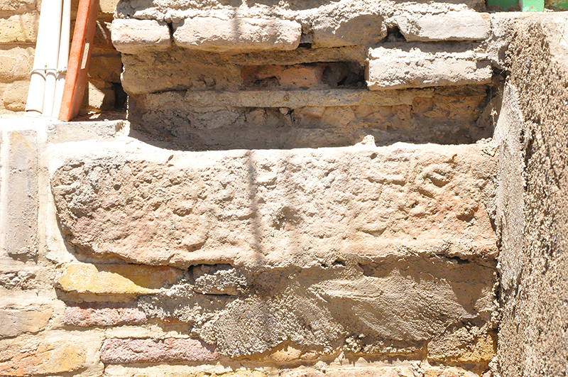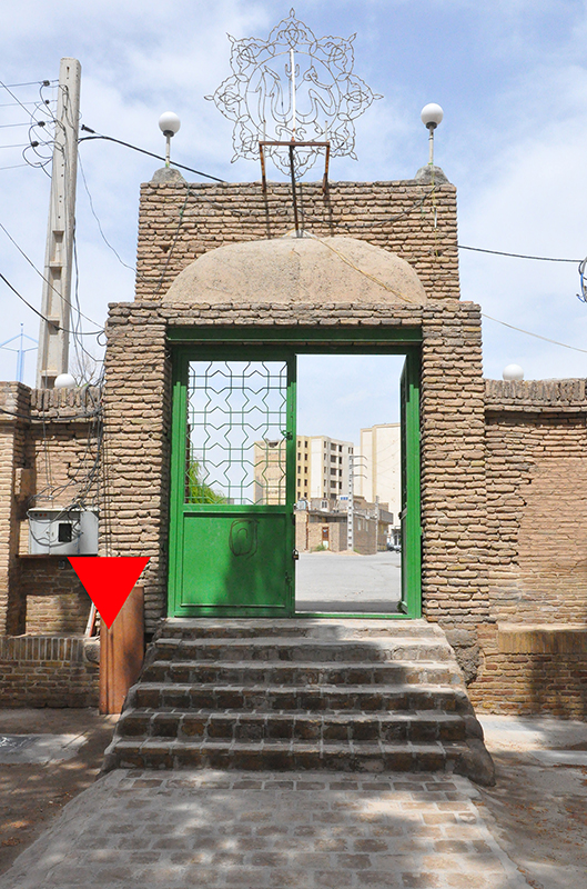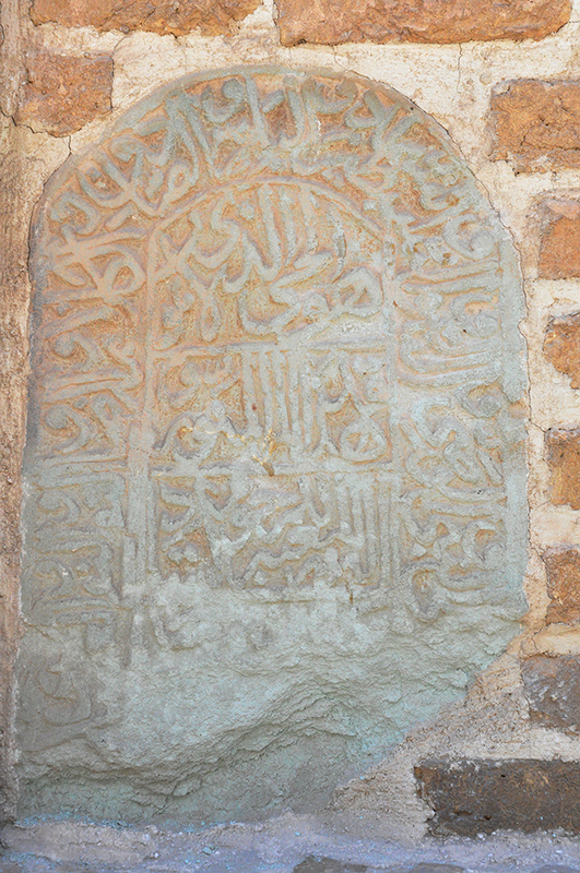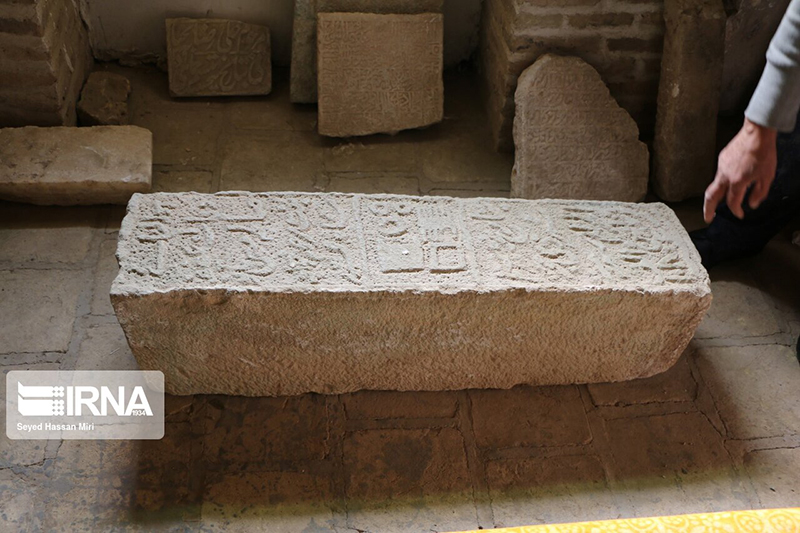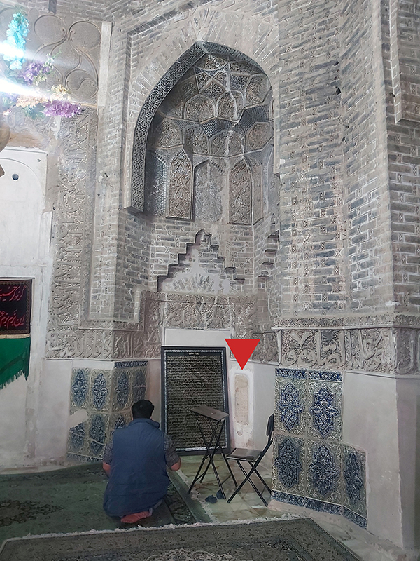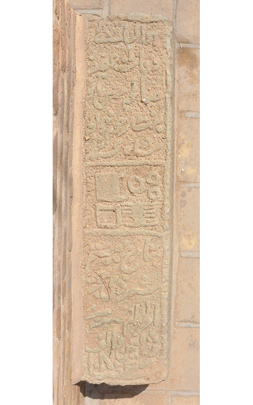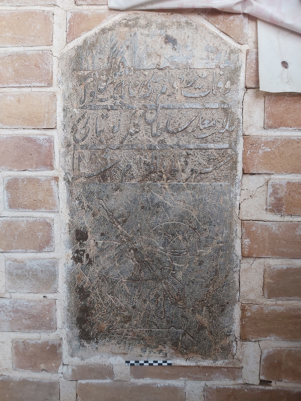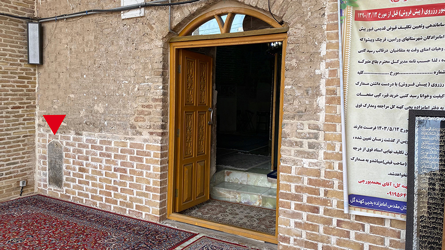 این سنگ گور به ابعاد ۳۷ در ۵۳ سانتیمتر است و به صورت ایستاده در نمای شمالی، سمت راست ایوان درِ ورودی اصلی بنا (ایوان شمالی) کار گذاشته شده است (ت. ۵). کتیبهی این سنگ به خط ثلث و با حروف برجسته است. بخش پایین کتیبه که حاوی نام متوفی و احتمالا تاریخ وفات بوده از بین رفته است. متن بخش حاشیهی کتیبه حاوی صلوات چهارده معصوم است که بخشهایی از ابتدا و انتهای آن از بین رفته است. با توجه به فرم کتیبه و نوع خط میتوان آن را به سدهی یازدهم هجری قمری نسبت داد (ت. ۶-۷).