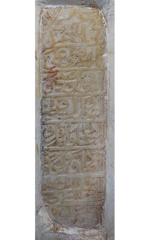 این کتیبه از جنس مرمر سبز به ابعاد ۲۰ در ۶۷ سانتیمتر است و داخل امامزاده، در گوشهی غربی محراب قرار دارد (ت. ۲).2 کتیبه به خط رِقاع نوشته شده و حاوی صلوات چهارده معصوم است. به درستی قابل تشخیص نیست که آیا بخش پایین کتیبه شکسته یا متن در همین بخش تمام شده است. احتمال دارد در ادامه نام متوفی ذکر شده باشد (ت. ۳-۴).