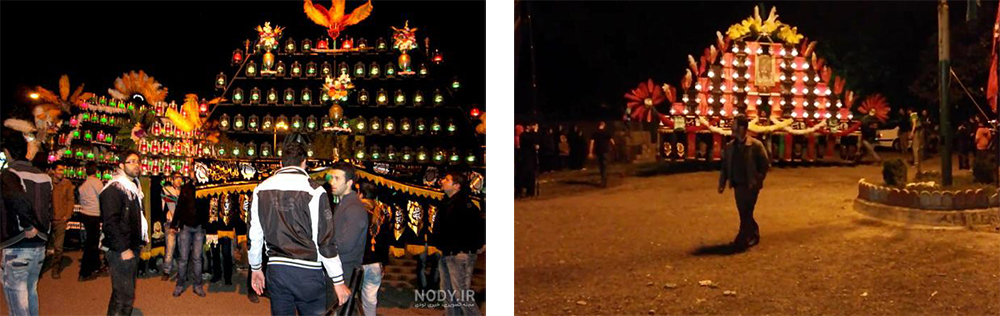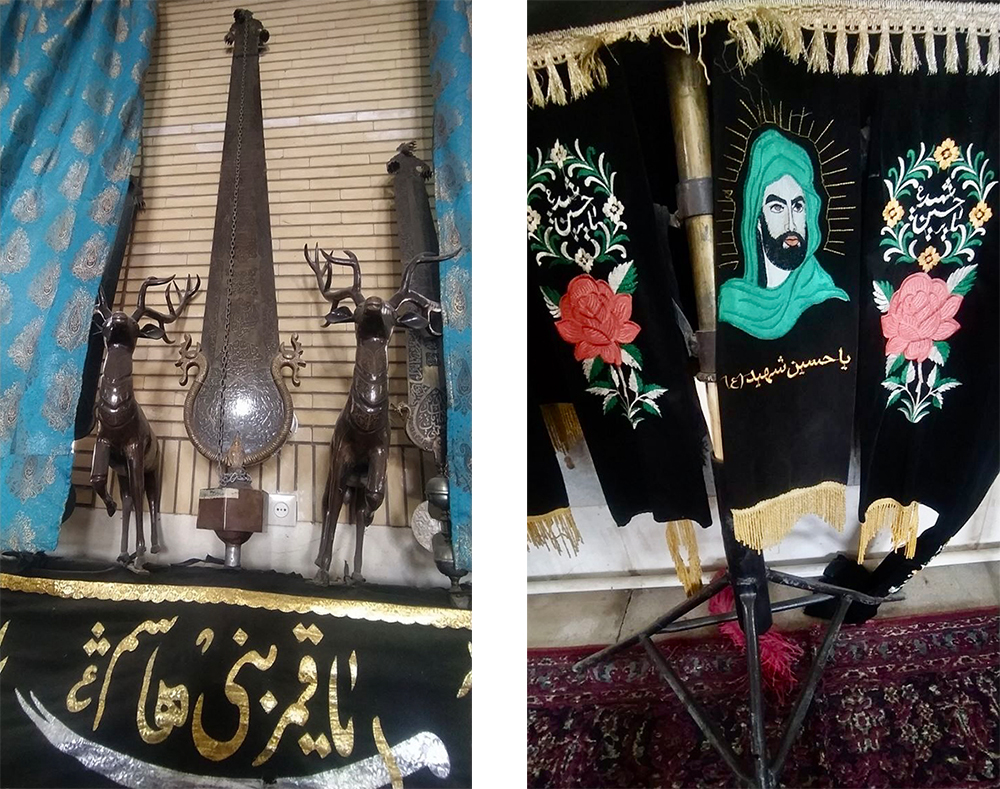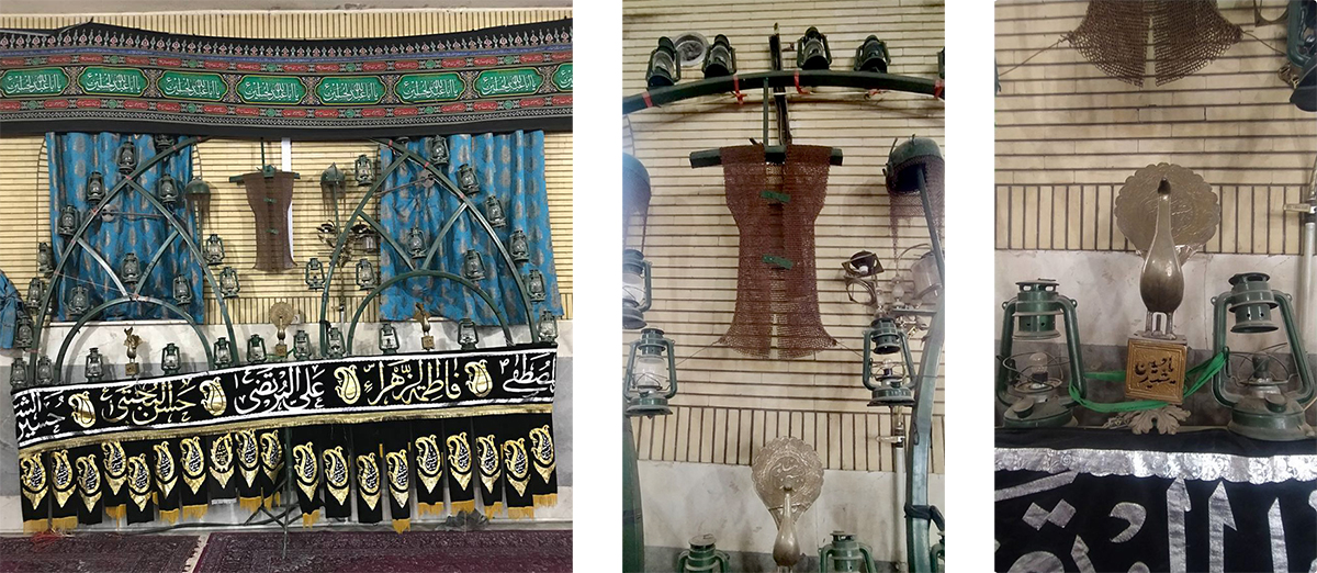 تصویر راست: علامت، ایران، ۱۳۴۸ش. تصویر چپ: چلچراغ، تاریخ ساخت نامشخص حسینیهی کنگرلوها، کهنهگل، ورامین عکس از جبار رحمانی، ۱۴۰۳ش.