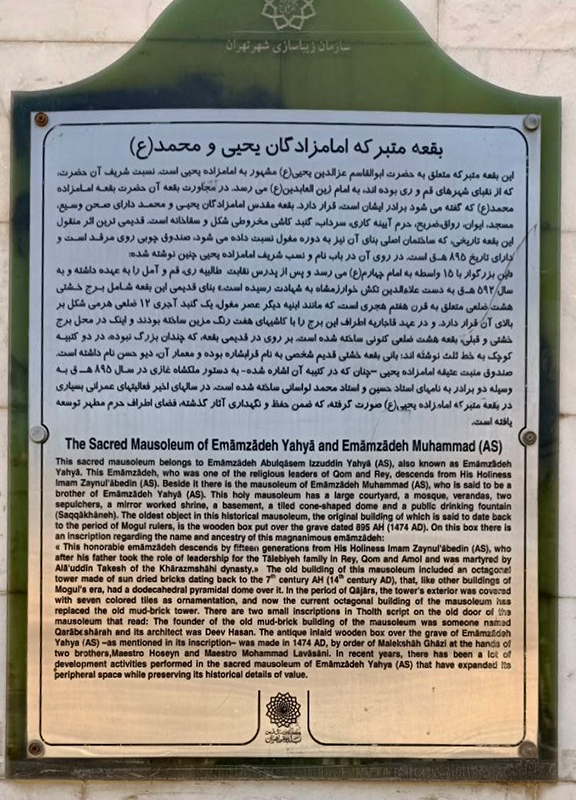 ارجاع: مریم رفیعینژاد، «درخت چنار امامزاده یحیی در تهران، و مقایسهی آن با درخت امامزاده یحیی در ورامین.» مدخل در امامزاده یحیی ورامین: نمایشگاهی آنلاین از زیارتگاهی ایرانی، به مدیریت و با ویراستاریِ کیلان اُوِرتون. ۳۳ آرچز پروداکشنز، ۶ اردیبهشت ۱۴۰۴. میزبان: خمسین: تاریخ هنر اسلامی آنلاین.